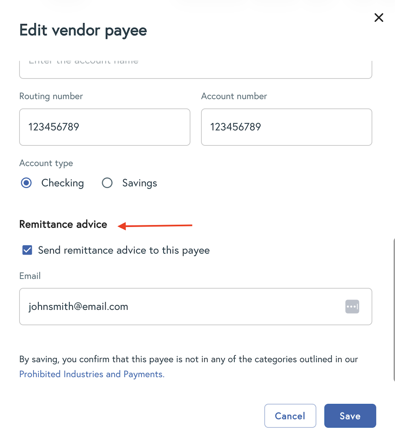 Select the option to send remittance advice to your payee.